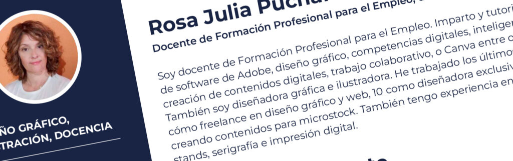 Soy diseñadora gráfica e ilustradora con larga experiencia como freelance en diseño gráfico, ilustración y diseño web. Tengo una experiencia de 15 años creando contenidos para microstock. De esos 15 años, he sido diseñadora exclusiva de Freepik durante 10. Soy también docente de Formación Profesional para el Empleo e imparto cursos de diseño y competencias digitales. Vivo en Valencia, España e imparto clases presenciales en Valencia y aulas virtuales en toda España.