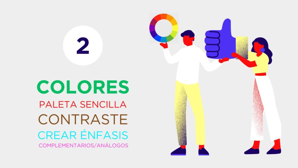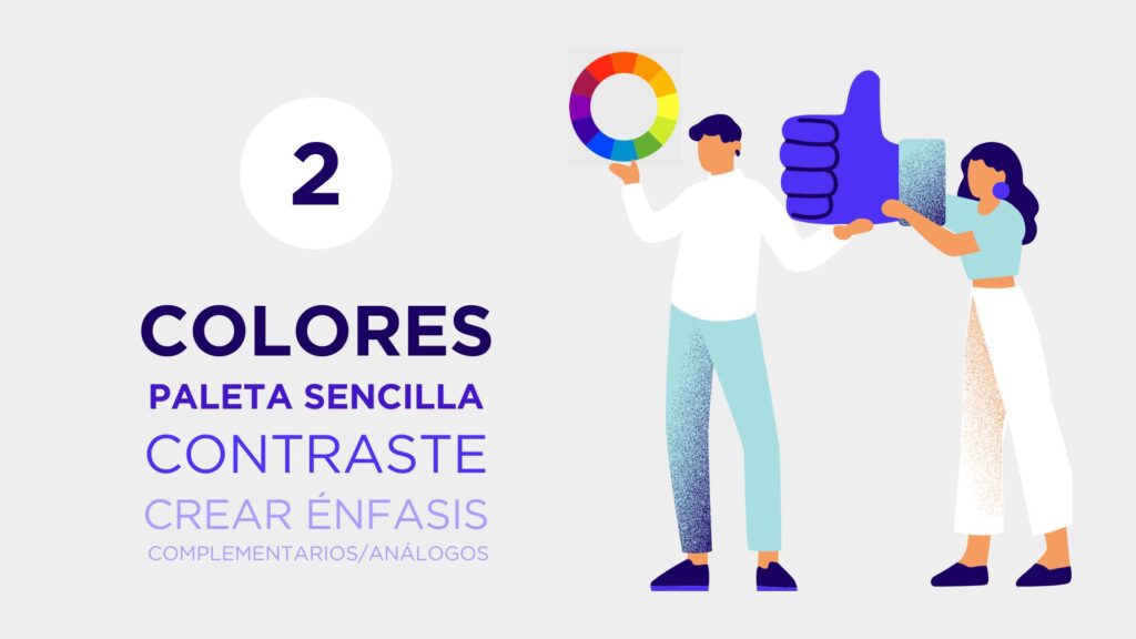 ✔️ Usa una paleta de colores sencilla. Esto hará que tu diseño se vea limpio y profesional. La rueda cromática te ayudará. Las combinaciones más usadas son monocromática (un solo color con sus tonos), análoga (colores vecinos), complementaria (opuestos directos) y triada (tres colores equidistantes).